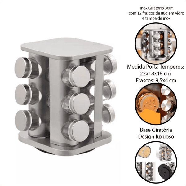 • Base Giratória : Encontre qualquer tempero com facilidade.